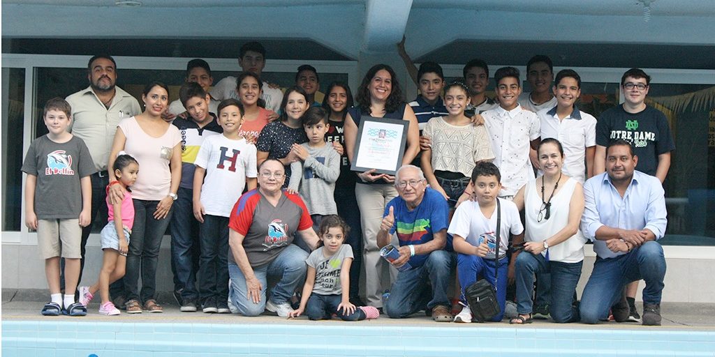 La ex nadadora posó para la foto del recuerdo junto a los seleccionados del club, al pie de la alberca de 18 metros donde entrenó día a día para lograr importantes éxitos deportivos para Chiapas y México.