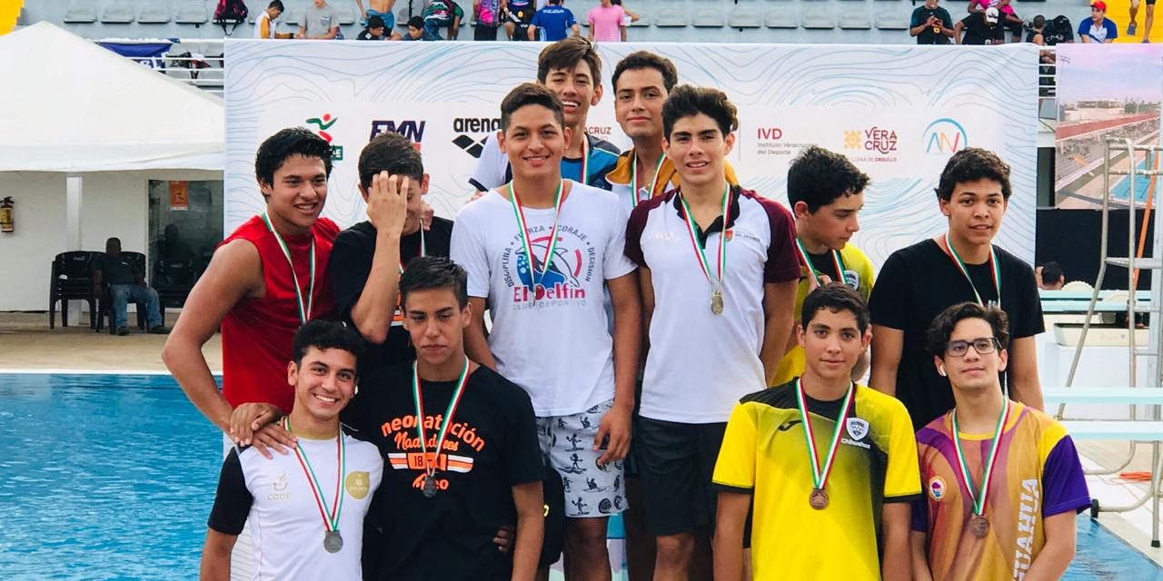 Un oro en relevos, más cuatro platas y cuatro bronces, fue la cosecha de los nadadores de El Delfín en la última jornada del Campeonato Nacional Curso Largo Clase Élite de la Federación Mexicana de Natación (FMN), celebrada este domingo por la noche en la alberca Leyes de Reforma del vecino estado de Veracruz.