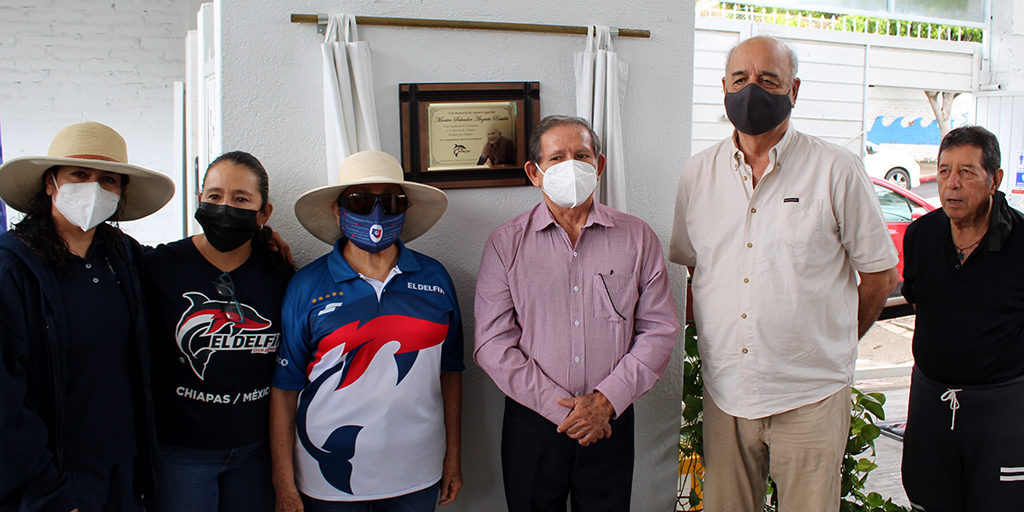 La profesora Amanda Moguel Rodríguez y el MVZ Roberto Anzueto Rosales, hermano del profesor, fueron los encargados de develar el memorial dedicado a nuestro querido maestro, cuyo legado para la natación y el deporte en Chiapas brillará por siempre.